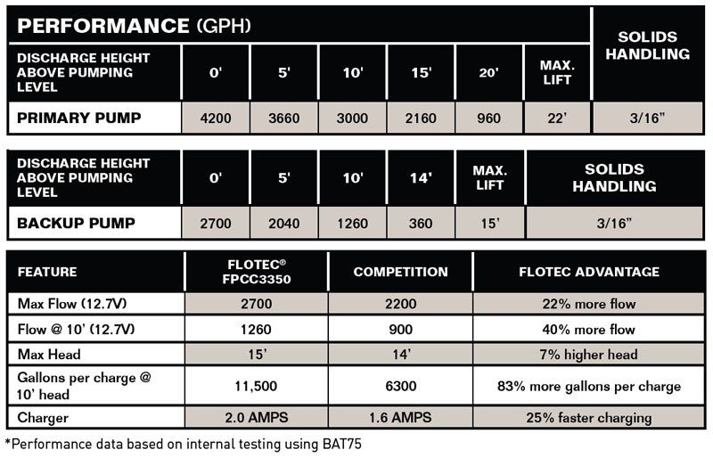 | FPCC5030 | Primary: 4200 GPH, Backup: 2700 GPH | Primary: 3000 GPH, Backup: 1260 GPH | 115VAC Primary Pump and Charger, 12VDC Backup Pump | 15 Amps |