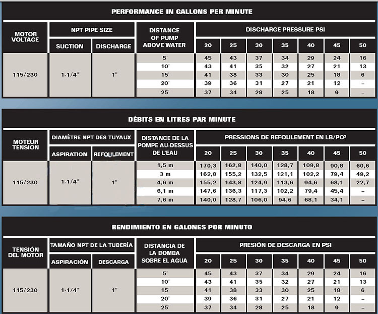 | Item # | Horse Power | MAXIMUM CAPACITY | FLOW at 10-foot LIFT and 30 PSI | AMP DRAW | Voltage | RECOMMENDED BREAKER | MAX WATER TEMP |