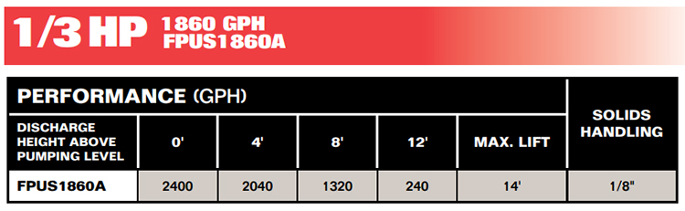 | FPUS1860A | 1/3 | 31 GPM | 20 GPM | 2.2 | 115v AC, 60 Hz | 1860 |