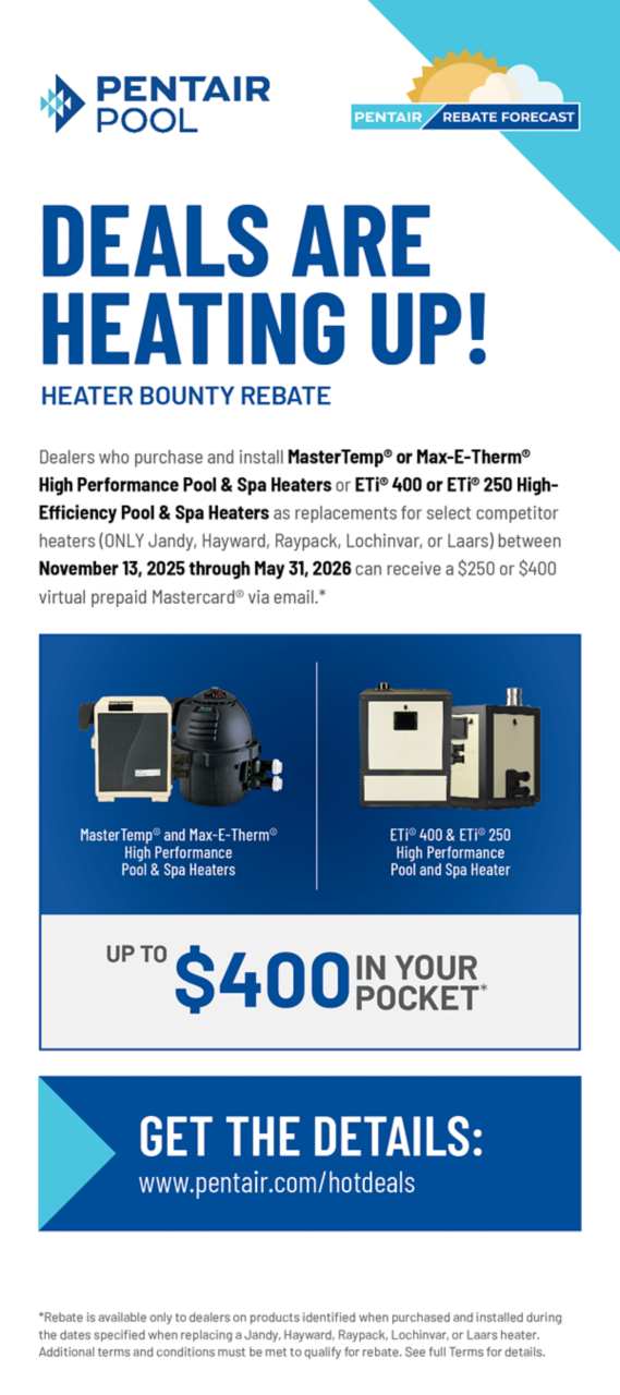 Soak up savings with rebates up to $200 for your customers. Must be purchased from a brick-and-mortar retailer, pool builder, or pool service professional. Pentair reserves the right to amend, modify, or terminate this program without prior notice. See full terms and conditions.